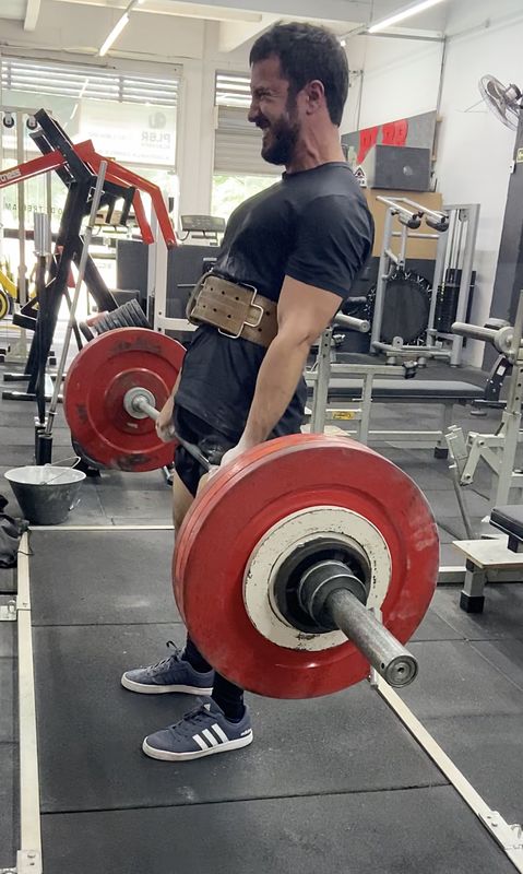 Eu lembro vagamente quando a ideia de competir despertou em mim. Vi alguma influencer do mundo maromba falar que, para competir, é preciso treinar sempre no padrão da competição. Seu agachamento deve ter uma profundida boa (a famosa "quebra da paralela"). No seu supino, a barra deve tocar no seu peito por algumas frações de segundo antes de subir. E o levantamento terra não permite o uso de straps. Entre outras coisas. Então eu pense, com temor: "competir deve ser muito difícil". Esse pensamento ecoou na minha cabeça por uns dias sem mudar de tom. Mas um dia sua valência, por assim dizer, mudou completamente: "competir deve ser muito difícil", eu pensei com certo entusiasmo. E daí eu comecei, nesse mesmo dia, a fazer uma dieta para baixar dos 80kg que eu tinha conquistado ao longo dos anos a pouco menos de 74kg (pois assim seria mais competitivo). Foi um horror. Quase passei mal nos primeiros dias, mas em 5 semanas eu tinha o peso certo. Também montei meus próprios treinos na base da tentativa e erro, o que durou pouco mais de dois meses, visando a melhoria daqueles lifts. O que eu de fato consegui: agachei com 180kg, fiz um supino com 110kg e um terra com 206kg. Meus melhores números (ainda que os padrões não fossem exatamente os de competição), que atingi quando estava com aproximadamente 77kg. Depois disso fiquei mais fraco porque acumulei muita fadiga sistêmica e senti que meus tecidos, especialmente os tendões, não estavam acompanhando a sobrecarga progressiva.